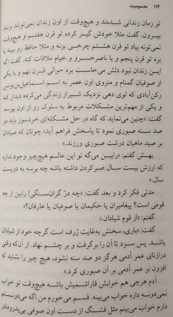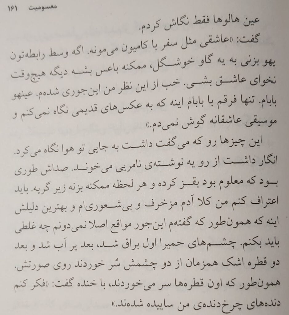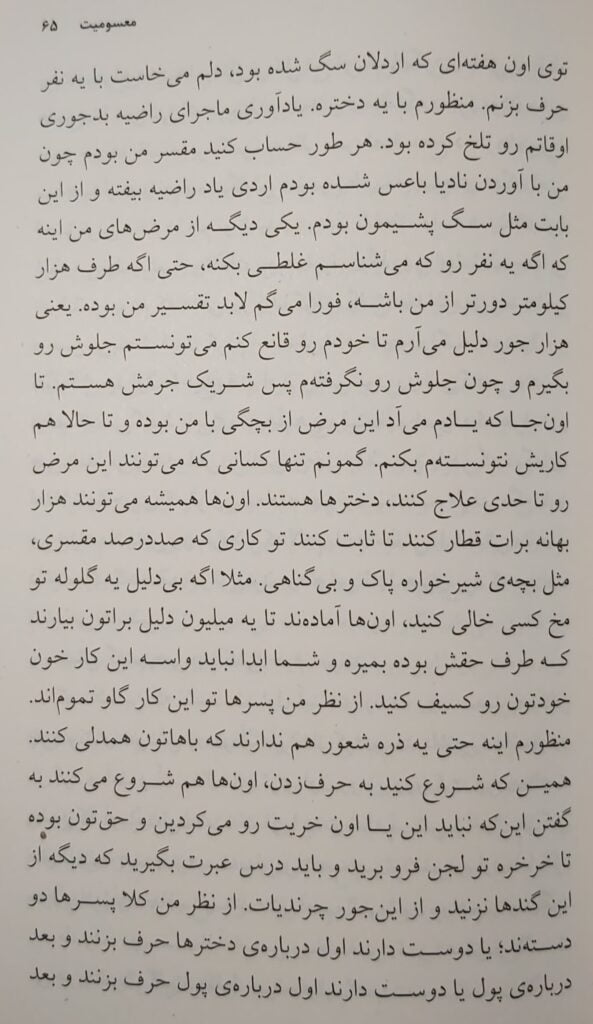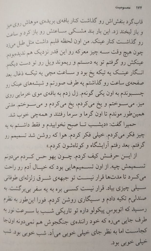 معسومیت، رمان جدید مصطفی مستور؛ روایتی اول شخص از اتفاقات یک زمستان چند دوست و آشناست، داستان میکوشد در مفاهیم معمول روابط اجتماعی مثل خانواده،عشق،دوستی،مرگ و کار با تردید بازنگری کند. هرچند نوشته جذابیت همراهی داشت ولی شخصیتها به ندرت به خوبی درک میشدند. نوشتار که عامدانه پر از غلطهای املایی و محاورات خیلی سبک است که هرچند خواندن کتاب را از یکواختی خارج میکردند و نویسنده هم آن را توجیه میکند،نپسندیم داستان شامل چندین مینیمال بانگاه متفاوت و جالب و قابل تامل بود برخلاف باقی داستانهای بلند مستور که پایانی عجیب و عمیق داشتند، پایانی ضعیف داشت.
