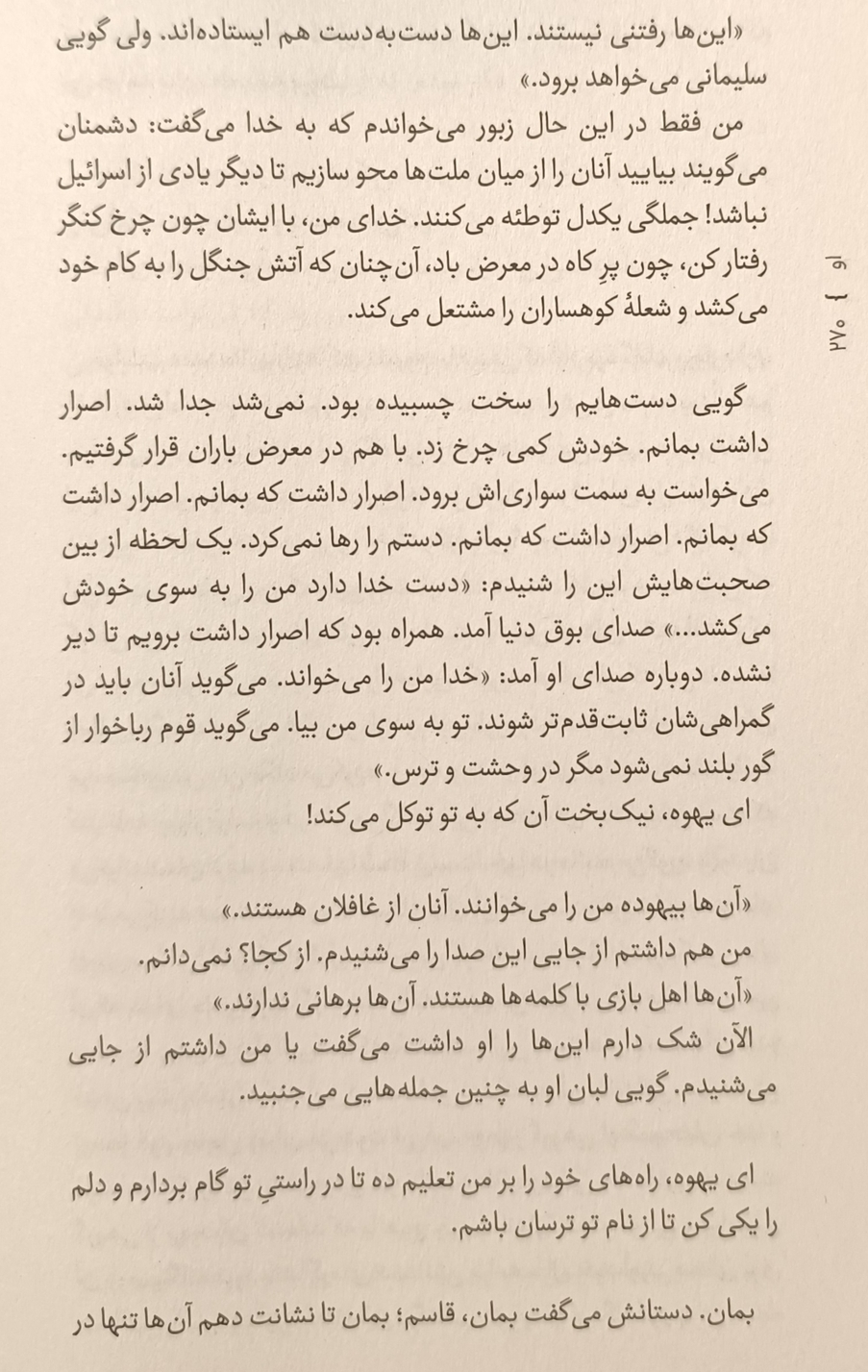دوستان میدانند که من دلِ خوشی از رمانهای شهدایی (بویژه هزلیات همسرانشان) ندارم و نمیپسندم، اما «او»؛ رمان آقای میثم امیری برگرفته از زندگی شهید عزیز عماد مغنیه طعم دیگری داشت، بویژه که هم این شهید عزیز را ویژه دوست داشتم و هم هدیه دوست عزیزِ صاحبسلیقهای بود. «او» که بیشتر آن را مستندی با روایت داستانی میبیبنم تا رمان، طعم لبنه، زیت و زعتری را میداد که تا حالا اصلا نخوردهام، بوی نسیم مدیترانهای میداد که تا حالا لمس نکرده بودم، تصویرسازی کتاب، شما را به مدیترانه میبرد؛ به صور و صیدا و ضاحیه، به روزهای اختلافات داخلی لبنان و مصطفا چمران، به تشکیلات ساف، به سوریه، به فلسطین، به حزبالله لبنان و سید حسن اعلهاللهمقامهالشریف، به حسرت حاج قاسم و به دنبال ردپای او. روایت کتاب که بازنویسی گفتههای خانواده، دوستان، همرزمان و دشمنان اوست، دچار نوعی ابهام خوابگونه است، تو گویی هر روایت، خاطره خوابی است مبهم که هرچند تصویر و حس قابل ادراک قویای برای همه حواس دارد ولی از شواهد مستند و جزییات متصل تهی است، ویژگیای که نمیدانم نقطه ضعف یا قوت کتاب است، چرا که شاید این نوع روایت، همچو جلد کتاب میکوشد بر اثر زندگانی این بزرگمرد بر جبهه مقاومت تمرکز کند تا جزییات دراماتیک فردی.
