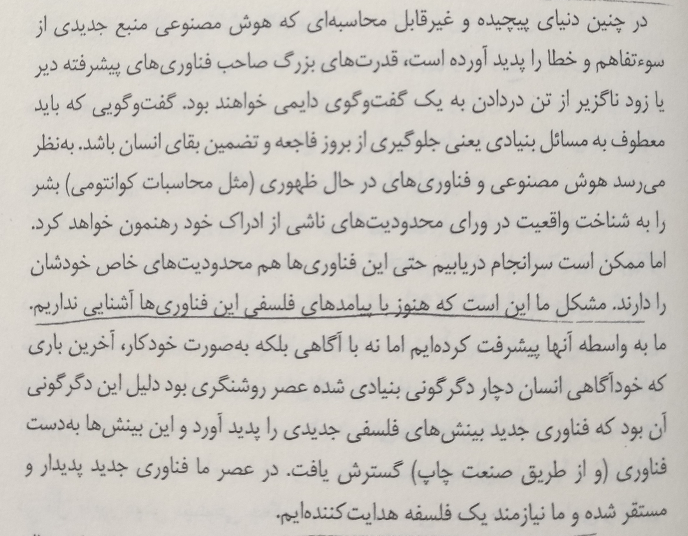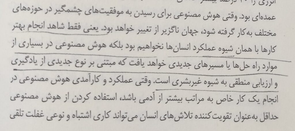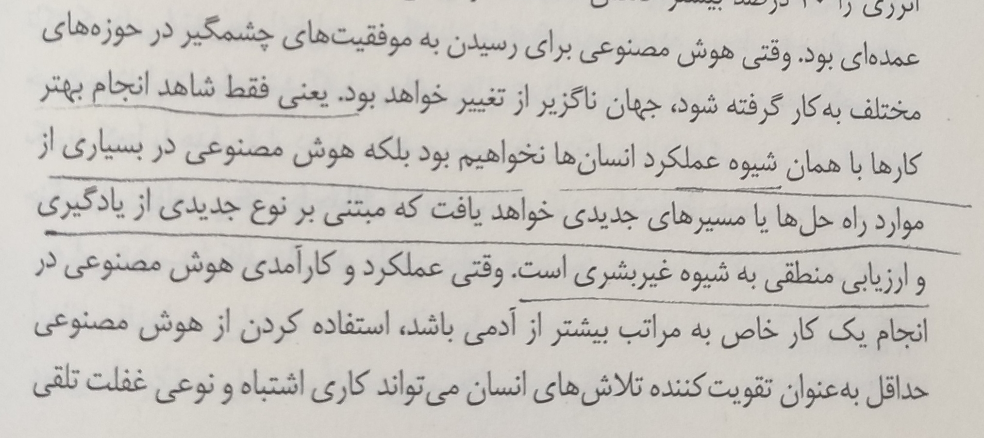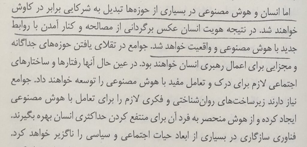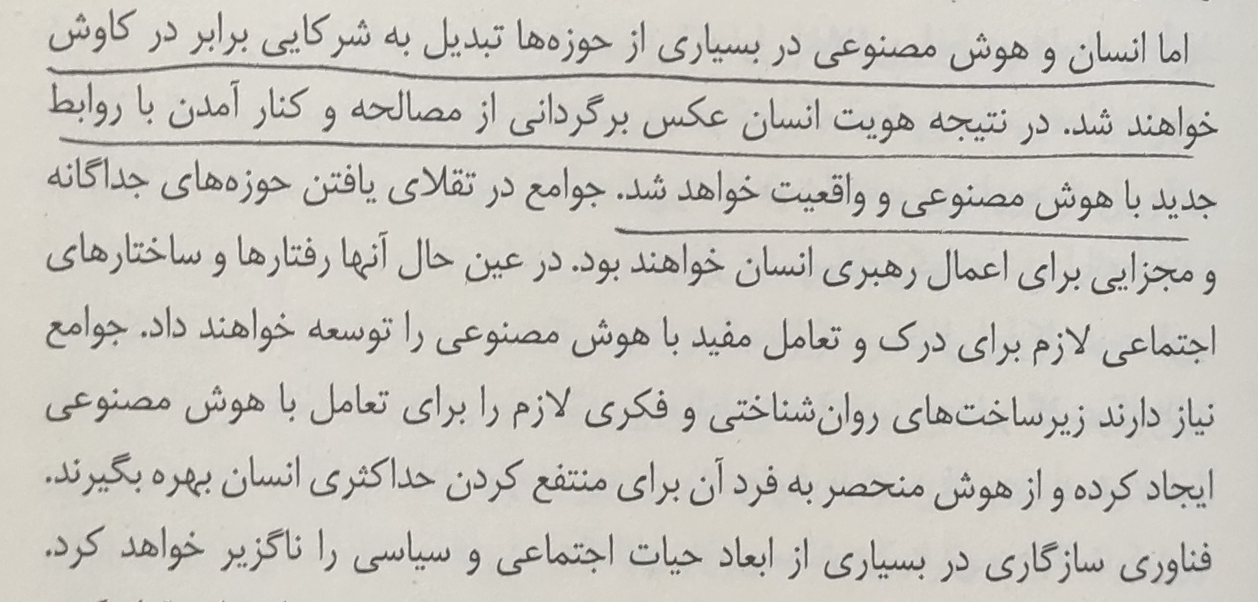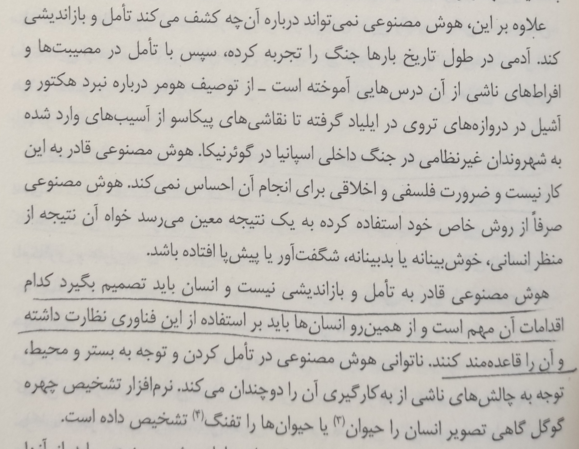 کتاب هوش مصنوعی و آینده بشریت گویی که اخطاریهای درباره روند رشد هوش مصنوعی و ابهامات و خطرات پیش روی این عصر بود. در پایان بنظرم کلام این کتاب میتوانست در یک مقاله بلند گنجانده شود، هرچند انتظار بیشتری از نامهای روی جلد کتاب داشتم و برایم چندان رضایتبخش نبود ولی اگر تمایل دارید یک مرور کلی به تحولات عصر هوش مصنوعی داشته باشید این کتاب و یا حداقل فصل پایانی این کتاب برای شما مفید خواهد بود.