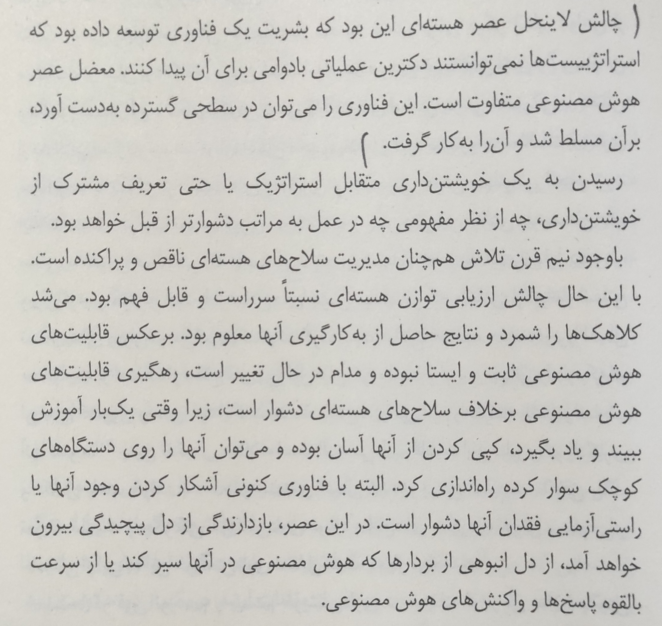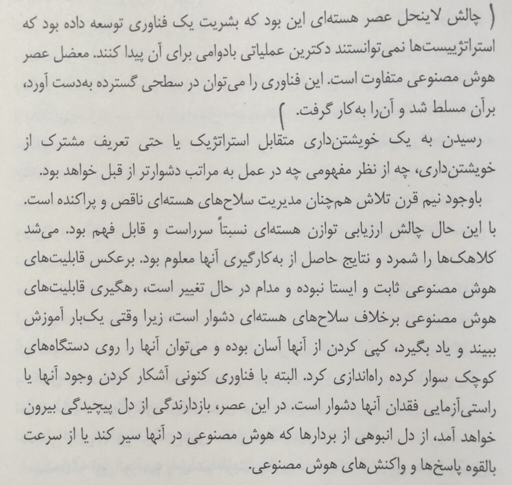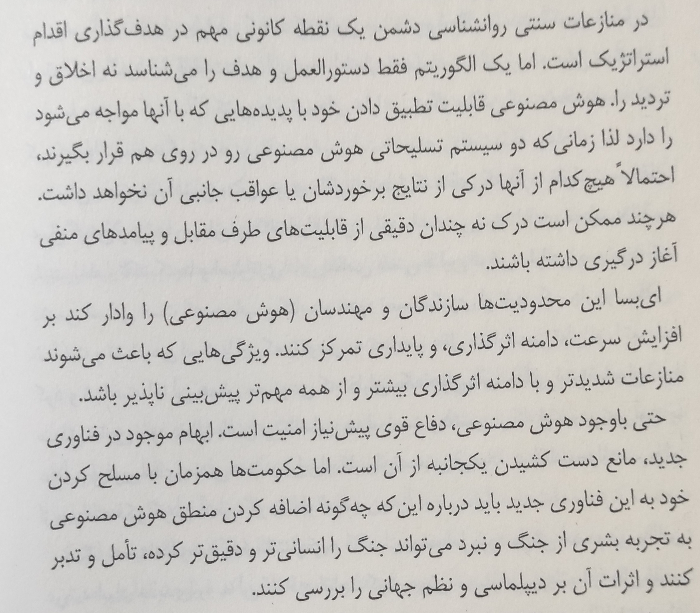 فصل پنجم با عنوان «امنیت و نظم جهانی» با مرور کوتاهی از نقش و جایگاه ابزار در تأمین امنیت ملتها تا دوران اتمی آغاز میشود و سپس با اشاره به مفهوم بازدارندگی و کنترل تسلیحات هستهای در قرن گذشته، به جنگ در عصر دیجیتال میرسد؛ جنگی که اکنون با تلفیق هوش مصنوعی بهمراتب مبهمتر و خطرناکتر شده است. نویسندگان در این فصل با توضیح پیامدهای غیرقابل بازگشت و آثار نامتعارف بهکارگیری هوش مصنوعی در سامانههای نظامی و امنیتی، به ناتوانی روشهای سنتیِ کنترل تسلیحات و حفظ موازنه نظامی در مواجهه با این فناوری اشاره میکنند. در پایان فصل نیز شش راهکار پیشنهادی برای اعمال کنترل و ایجاد محدودیتهای نظامی بر قدرتهای مجهز به هوش مصنوعی ارائه میشود.