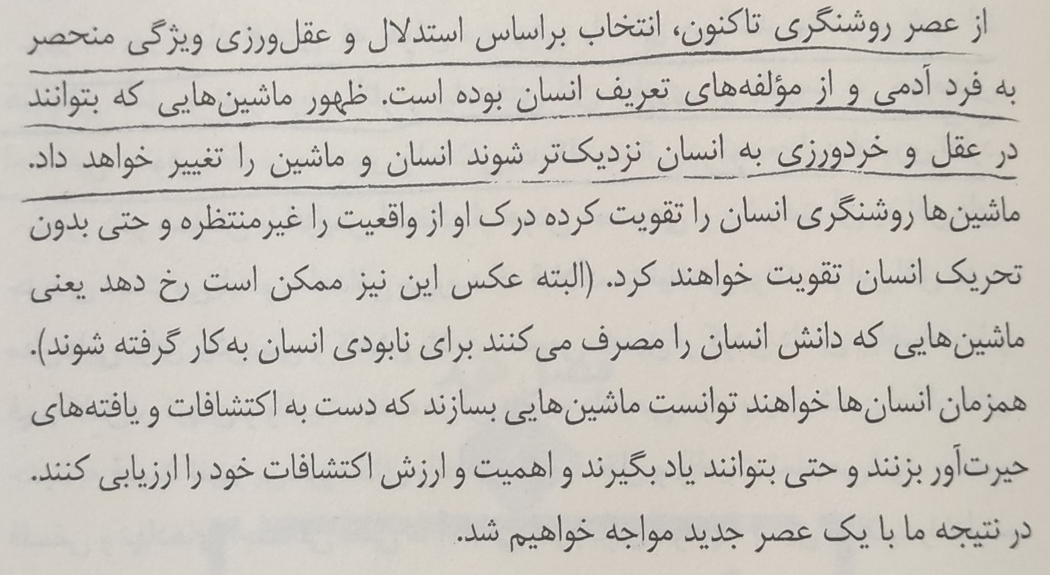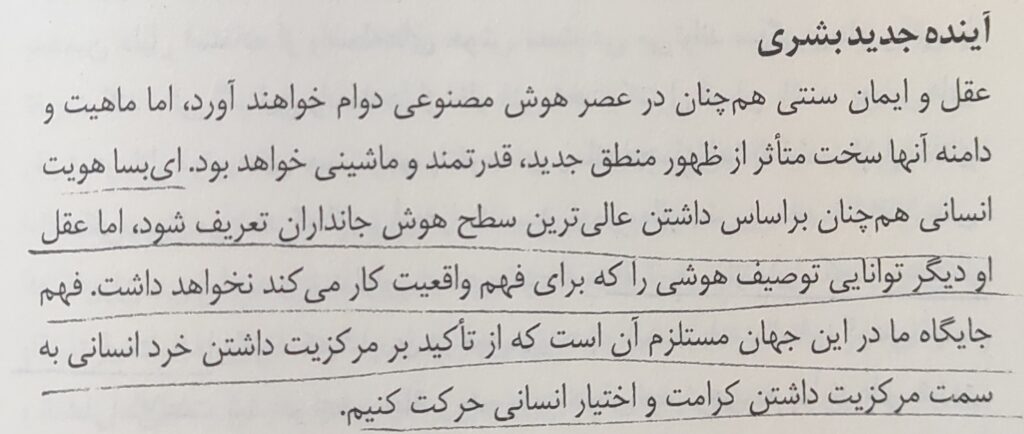 عقل و ایمان سنتی همچنان در عصر هوش مصنوعی دوام خواهند آورد، اما ماهیت و دامنه آنها سخت متأثر از ظهور منطق جدید، قدرتمند و ماشینی خواهد بود. ایبسا هویت انسانی هم چنان بر اساس داشتن عالیترین سطح هوش جانداران تعریف شود، اما عقل او دیگر توانایی توصیف هوشی را که برای فهم واقعیت کار میکند نخواهد داشت. فهم جایگاه ما در این جهان مستلزم آن است که از تأکید بر مرکزیت داشتن خرد انسانی به سمت مرکزیت داشتن کرامت و اختیار انسانی حرکت کنیم.