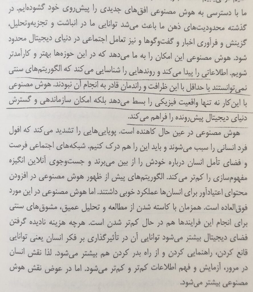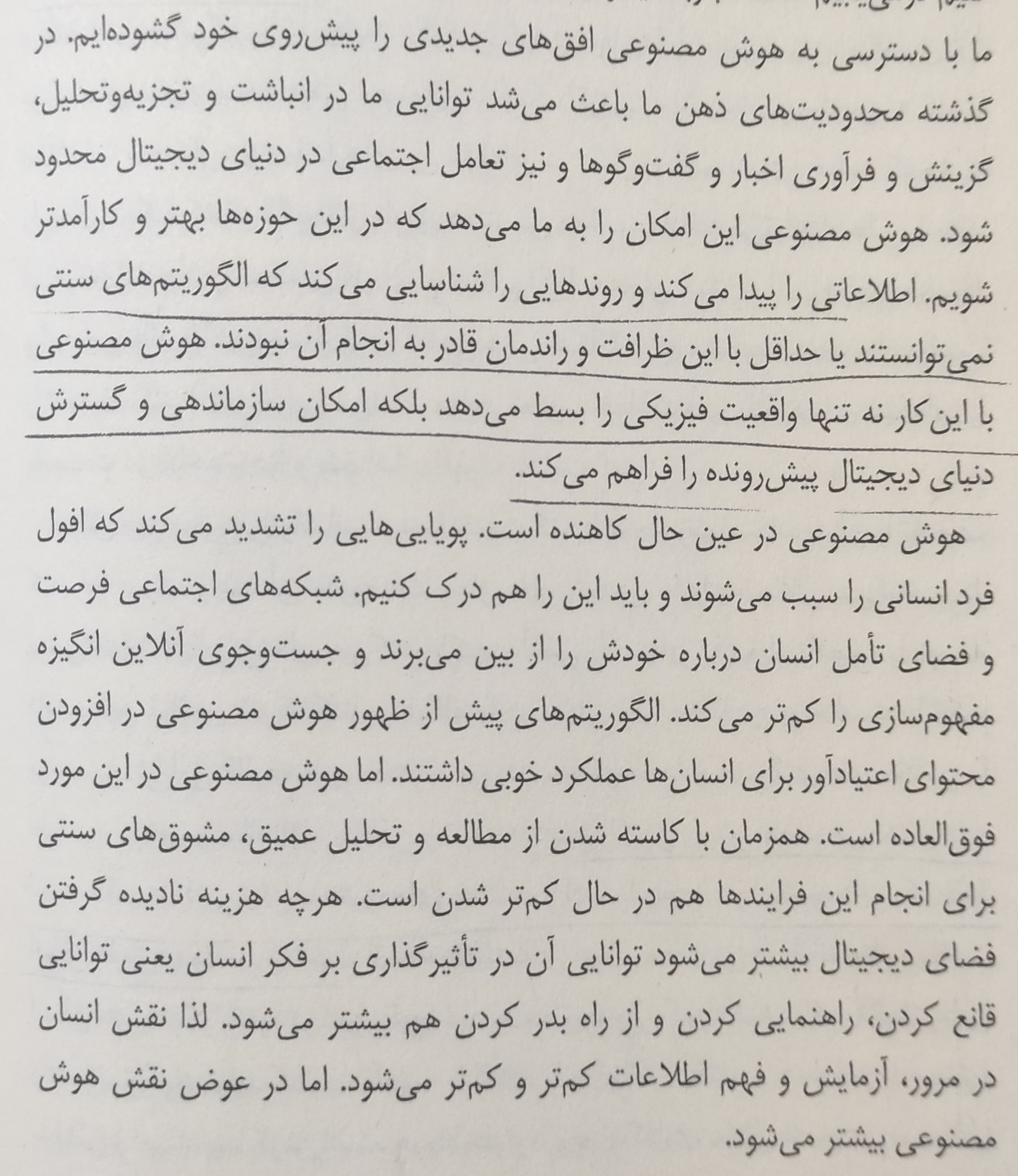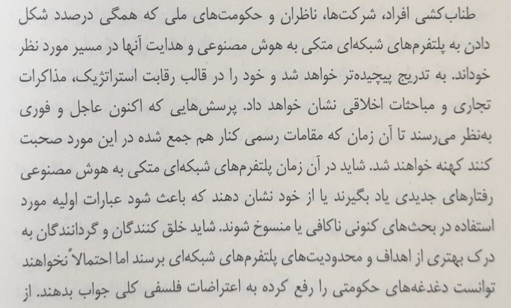 نکته دیگر اینکه این کتاب در سال ۲۰۲۱ و در دوران پیش از فراگیری کنونی هوش مصنوعی منتشر شده است. به همین دلیل، با توجه به رشد پرشتاب سه سال اخیر، برخی تحلیلهای آن امروز با واقعیتهای روز همخوانی کامل ندارند و بعضی گزارهها نیز حکم مطالب تاریخگذشته را پیدا کردهاند.