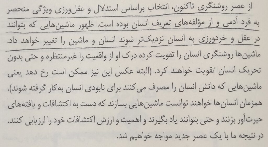 عینک غربی نویسندگان در مبانی فکری هم خود را در ستایش و ارجاع پرتکرار به عصر روشنگری (به قول خودشان) به نمایش میگذارد، از همین رو اغلب تحلیلهای کتاب مبتنی بر اصول راسیونالیسم، اومانیسم و سوبژکتیویسم است، بطور مثال کتاب، عقل انسان که مرتبهای وجودی برای ادراک حقایق است، صرفاً در قالب عقل دکارتی و ابزار تحلیل ذهنی مینماید لذا در تقابل عقل و هوش مصنوعی چنین مینویسد: