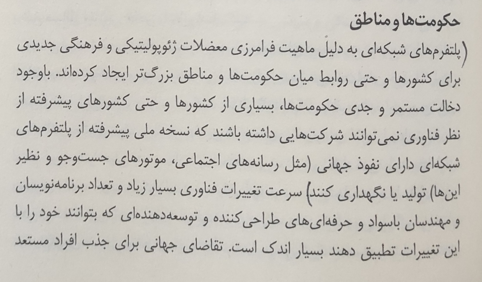 فصل چهارم با عنوان «شبکه جهانی پلتفرم» با بازتعریف تصور سنتی و سینمایی از هوش مصنوعی ـ که معمولاً در قالب رباتهای دارای احساس، آموزنده و سخنگو تصویر میشود ـ چهرهای واقعیتر از نقش این فناوری در بهبود عملکرد پلتفرمهای آنلاین و زیست دیجیتال انسان امروز ارائه میکند. کتاب با بیان نقش این پلتفرمهای مبتنی بر هوش مصنوعی در روابط میان انسانها، شرکتها، ملتها، حکومتها، مناطق مختلف و همچینن اثرات ژئوپولیتیک این روابط، به پیچیدگی چالشهای پیشروی توسعه جهانی این تکنولوژی میپردازد.